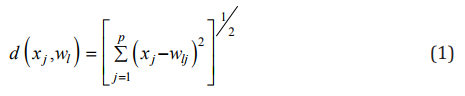 One of the more important ANN is the Self-Organization Map (SOM) proposed by Kohonen. In this network there is an input layer and the Kohonen layer, which is usually, designed as two-dimensional arrangement of neurons that maps n-dimensional input to two-dimensional. It is basically a competitive network with the characteristic of self-organization providing a topology-preserving mapping from the input space to the clusters. Mathematically networks and SOM require input vectors xJ=(x1,x2,x3,.....xJP) training weights wl=(wl1,wl2,.....wlp), where l indicates the number of nodes, Wlj denote the weights assigned to entry of nodeand is number input variables.where l indicates the number of nodes, lj w denote the weights assigned to entry j x of node l and p is number input variables One way to establish the structure of the SOM type neural network is shown in Figure 1, which indicates that the basic structure of the network must be input layer, hidden layer and output layer, the number of neurons in each layer is determined by the information processing capacity and robustness to want to project the problem, the problem presented in this work a static neural network is established with a number finite neurons, 20 neurons in each of the layers of the neural network.