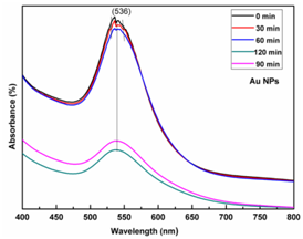 Figure 1 shows the UV-Visible spectrum of gold nanoparticles recorded from the reaction medium at the interval of (0, 30, 60, 90 and 120 mins). The maximum absorption characteristic Surface Plasmon peak is located at 536 nm indicates the formation and presence of Au nanoparticles. The color changes are due to excitation of surface Plasmon vibration in gold nanoparticles. The SPR and color change in AuNPs particles. The maximum absorption spectra band are shifted to longer wavelength are due to the increase in concentration level and time of exposure on surface of Au nano particles which indicates the formation of more or larger number Au particles in different size from 536 nm to 544 nm as shown in Figure 1. The formations of phase change and crystalline nature of Au nanoparticles were confirmed by X-ray diffraction patterns of synthesized gold nanostructure produced by the leaf extract in support with UV-Vis analysis.
