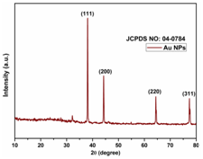 The average of grain size of the AuNPs formed in the bio-reduction process was determined using Scherer’s formula and was estimated at 32 nm. The calculated lattice constant from this pattern was 4.085. The XRD results clearly show that AuNPs was formed by the reduction Au+ ions AuNPs and revealed the spherical structure of AuNPs and the high peaks indicates the active silver composition and crystalline nature of the AuNPs. The compound is stable, which is confirmed by its angle values.