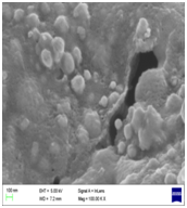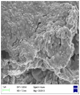 Further the result of the UV-Vis spectra of the biosynthesized AuNPs were confirmed by the characteristic peaks observed in the XRD image and the structural view under the scanning electron microscope as shown in Figure 2. The formations of phase change and crystalline nature of Au nanoparticles were confirmed by X-ray diffraction patterns of synthesized gold nanostructure produced by the leaf extract in support with UV-Vis analysis. The characteristics peaks of Au nanoparticles are located at peak value of 2ϴ = 38.12°, 44.4°, 65.1° and 78.12° for the indexing angles of reference planes at (111), (200), (220), and (311) as shown in Figure 1, which well matches with data base of JCPDS number : 04-0784. A very high crystalline and nano level particles with face-centered cubic (fcc) crystallographic references planes of Au nanoparticles. The average crystalline size of the nanoparticles formed in the bio reduction process found to be 32 nm. The lattice constant calculated from this pattern was 4.0885 A. The analysis revealed spherical structure of AuNPs and high peaks indicates the active silver composition and crystalline nature of the AuNPs. The compound is stable, which is confirmed by its angle value. The diffracted intensities were recorded from 2angles and values were used to calculate the grain size by using the Scherer’s formula.