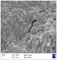 The FESEM are the best analysing tool for structural and morphological properties of synthesised materials. Figure 3 shows structure and the morphology of AuNPs investigated using FESEM analysis. The images reveals that the green synthesized AuNPs particles are spherical/sphere like structure with microporous nature in shape with agglomerations, and the dimensions of the spherical shape are between 45nm in width of smooth surface of AuNPs which have well dispersive property. This image reveals that the green synthesized AuNPs exhibits that almost all the particles are spherical shape with agglomeration and the dimensions of spherical shape are between 50-200 nm in width observed in different magnification.