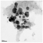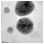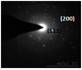 The morphology and internal crystalline structure of obtained nanoparticles was studied by the high resolution transmission electron microscopy and the selected area electron diffraction is carried out to find lattice planes of index (HRTEM and SAED) as shown in Figure 4. The HRTEM image of synthesized AuNPs was found to be spherical shaped grain like morphology with various radius ranging from 0.5 nm to 5 nm. It was found that AuNPs spherical shaped with minimum particles sizes ranges 10 nm scales is shown in Figure 4. The selected area electron diffraction (SAED) patterns confirmed the presence of elementals AuNPs which well matches with the crystallographic data resulted of XRD analysis. The diffraction rings agrees with JCPDS data major indexing peaks (311) (Table 1).