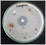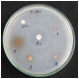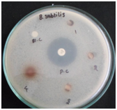 Figure 5 Antibacterial activity of synthesized gold nanoparticles (leaf extract) on (a) gram-negative bacteria like E.coli, Pseudomonas aeruginosa and gram-positive bacteria like Bacillus subtilis respectively by the disk diffusion method.