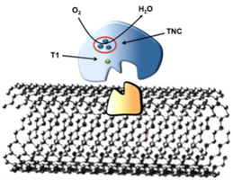 A new approach for improved enzyme-electrode interactions and ultimately for enhanced bacteria-electrode electron transfer has been developed.17-19 This approach is based on the specific enzyme-substrate interactions, relying on key-lock principle that is the main advantage of enzymatic catalysis. Depending on the enzyme type two approaches were developed. The first approach uses modification of the electrode surface with enzyme`s natural substrate or its functional analogue, which ultimately results in proper enzyme orientation and facilitated electron transfer (Figure 2). This hypothesis was applied for the orientation of two of the most famous oxygen-reducing enzymes, Bilirubin Oxidase and Laccase and its rationality was demonstrated in the development of oxygen reducing electrodes.17,18 Further this hypothesis was transferred towards enhancement of electron transfer from “anodic” enzymes towards solid supports, where the enzyme terminal electron acceptor was utilized for electrode surface modification. This approach led to eight fold increase in the performance of an anode composed of pyrroloquinoline quinone (PQQ) dependent glucose dehydrogenase, very promising enzyme for the design of glucose sensors.20,21