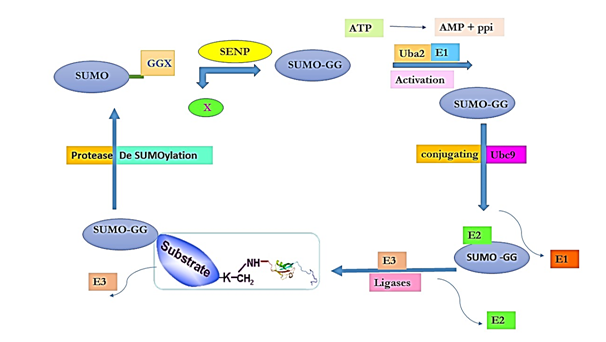 Post-translational modification by the Small Ubiquitin-like Modifier (SUMO) proteins, a process termed SUMOylation, is involved in many fundamental cellular processes. SUMOylation is a eukaryotic post-translational modification, which consists of a reversible attachment of members of the Small Ubiquitin-like Modifier (SUMO) protein family on a protein substrate resulting in the dynamic regulation of its biochemical properties .4 Proteins involved in many fundamental cellular processes like DNA repair, transcriptional control, chromatin organization, macromolecular assembly and signal transduction are SUMOylated.5 SUMOylation is also discovered to be involved in various diseases and disorders especially neural ones, such as Alzheimer’s disease and Parkinson’s disease.6-8