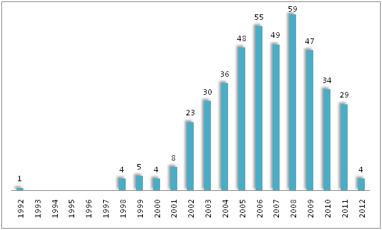 The size of SUMO proteins is almost 10 kDa and three-dimensional structures of these proteins are similar to ubiquitin proteins. Interestingly, SUMO proteins have different distribution of surface charge and have less than 20% amino acid sequence similarity.10 During SUMOylation, a SUMO protein is attached to the target protein, which has an acceptor lysine, through three enzymes and then makes the modification. Finally, SUMO is detached by sumo-specific protease.4 (Figure 2). SUMO proteins have been discovered in a wide range of eukaryotic organisms.9 SUMO family has four isoforms in human, one isoform in yeast and eight isoforms in plants .10,11 However, in most vertebrates family SUMO has three isoforms that are known as SUMO1 namely (sentrin، PIC1، GMP1، Ubl1، Smt3c) and SUMO2 namely (sentrin-2, Smt3b) and SUMO3 namely (sentrin-3, Smt3a).11-15 Figure 3 shows the number of papers that have reported experimentally verified SUMOylation in different years, these information are based on the PubMed IDs reported by dbPTM .16 recently published database about PTM data.