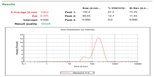 The prepared formulations have been analysed for drug content, encapsulation efficiency and mean particles size, and polydispersity index. Under the optimum preparation conditions, small lipid nanoparticles with a relatively uniform size distribution were obtained. Figure 4 The mean dynamic light scattering particle diameters fell between 111.9 nm and 255 nm with PDI values below 0.3 indicating fair size distributions.25,26 Encapsulation of water soluble or hydrophilic drug into a solid lipid matrix is one of the challenges associated with this type of formulation and requires appropriate approach to address it27 So far, the optimized formulation has shown up to 81.75% encapsulation efficiency. The relatively high level of encapsulation plays an important role in the achievement of desirable prolonged release effect. Thus, it can be concluded that hot micro emulsion method and excipients used in this study are suitable to produce TPT-SLNs. Table 1 Presents the results of particles size, % drug content and encapsulation efficiency of all the formulations.