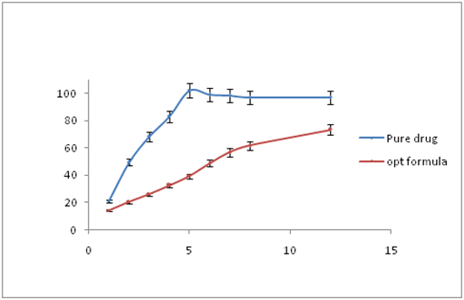The in vitro release of Topotecan hydrochloride from the prepared solid lipid nanoparticle formulations and pure drug was studied in pH 6.8 phosphate buffer as that is the intestinal pH. The drug release was measured for 12 hr. The pure drug has showed complete release at around 3 hours. This is not surprising since the drug is not in a sustained formulation. In contrary, for the TPT-SLN formulation, prolonged release was noticed, which suggests that the drug was significantly encapsulated insight the lipid matrix.28 The cumulative drug release for the optimized formulation was about 73.47% at 12 hr Figure 5.