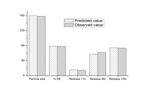 In the numerical optimization techniques, the desirability approach was used to generate the optimum settings for the formulation. For the optimized formulation, the particles size was kept at the targeted value, the drug release at 1st hr was kept at minimum, the drug release at 8th hr was kept at minimum, and drug release at 12th hr was kept at minimum. The encapsulation efficiency was also kept at maximum. The optimized formulation was prepared according to predicted model and evaluated for responses. The result of the optimized formulation has been further compared with the predicted model values.