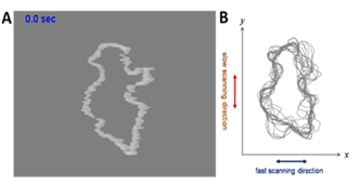 Figure 2 Dynamic motion of DNA in solution captured by fast-scanning AFM. (A) A snapshot of a 3 kbp DNA plasmid. (B) Consecutive AFM images obtained over 30 seconds were overlaid. The data illustrate thermodynamic fluctuations.