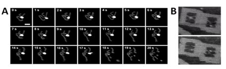 The first notable application of AFM to biological samples was the observation of DNA in the late 1980s, albeit with many technical limitations. The scanning could be done only with the contact mode which resulted in serious damage to the sample; therefore, the specimen required a protective coating, e.g. cytochrome C. With technical advances over the past 20 years, it is now possible to analyze the physical properties of naked nucleic acids in solution (e.g. thermodynamic fluctuation) using high-speed AFM with sub-second temporal resolution, and without fixation (Figure 1). This new single-molecule analytical method opens up a way of exploring the molecular mechanisms of DNA-protein interactions. For example, the binding and action of restriction enzymes on DNA.8,9 (Figure 2A) and RNA polymerase.10 have been explored.