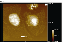 Figure 3(B1) AFM image of HeLa cells depleted of plasma membrane and cytoplasm. HeLa cells on a coverslip were sequentially treated with Buffer A containing 0.5% Triton X-100, Buffer B containing 250 mM (NH4)2SO4, and 10 U/ml DNaseI (B1).