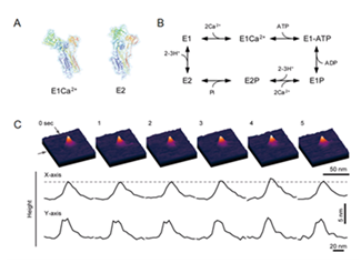 Figure 4 Single-molecule imaging of SERCA1 dynamics in the presence of nucleotides and calcium ions. (A) 3D structures of SERCA1: E1Ca2+ form (left) and E2 form (right). (B) Simplified Albers-Post scheme for SERCA1. (C) Time-lapse sequence AFM images of SERCA1 in the SR membrane on a mica surface in buffer solution were taken in the presence of 10 nM ATP and 100 μM free Ca2+ at a rate of 1 frame per sec. The Z scale is 20 nm. The resulting profiles are shown in the corresponding lower panel. The broken line indicates a height of 5.5 nm from the membrane surface.