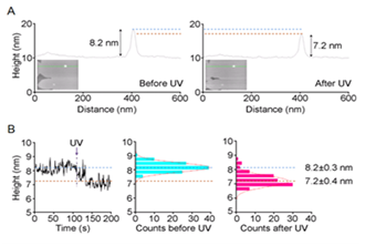 If the target protein is not abundant, reconstituted lipid bilayer with proteins purified from expression systems can be used for AFM studies. This is now a standard method for studying ion channels by AFM. Figure 5 illustrates fast-scanning AFM analyses of the heterotetrameric GluN1/GluN2A (NMDA) receptor reconstituted into a lipid bilayer.28 (Figure 5). AFM combined with a specific antibody has revealed two types of height distribution above the bilayer surface in the absence of agonist: the extracellular and intracellular regions of the receptor exhibit heights of 8.6 nm and 3.4 nm, respectively. Fast-scan AFM imaging, combined with UV photolysis of caged glutamate, permitted the detection of a rapid reduction in the height of individual NMDA receptors. The height of the particle above the bilayer before photolysis fluctuated at around 8.2±0.3 nm; after photolysis, the height rapidly fell to 7.2±0.4 nm (Figure 5). The reduction in height did not occur in the absence of glycine or in the presence of the selective NMDA receptor antagonist D-(-)-2-amino-5-phosphonopentanoic acid (D-AP5), indicating that the observed structural change was caused by receptor activation. These results represent the first real-time demonstration of an agonist-induced effect on the structure of the NMDA receptor.