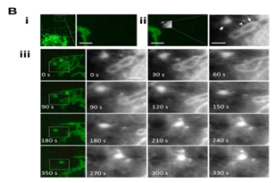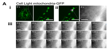 Figure 6A All examples show a fluorescent image of living COS-7 cells expressing Cell Light mitochondria-GFP (i), an overlay of an AFM image on the fluorescent image (ii), sequential AFM images taken at 0.1 fps (iii).