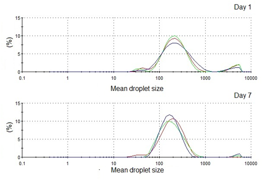 Figure 1 Mean droplet size and polidispersity of nanoemulsions prepared with 5% (w/w) of tucuma oil, 5% (w/w) of surfactants (HLB 13) and 90 % (w/w) of water. Day 1: Mean droplet - 198.9±1.601 nm; polidispersity – 0.377±0.024. Day 7: Mean droplet – 156.6±0.6557 nm; polidispersity – 0.240±0.006