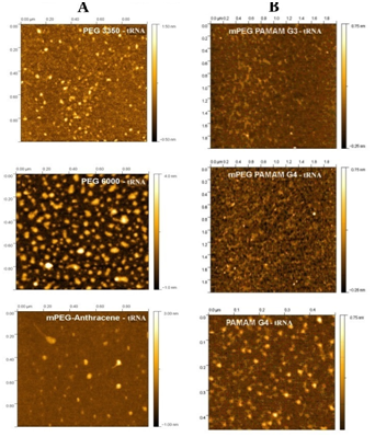 Figure 1 Tapping mode AFM images in air of synthetic polymer-tRNA complexes diluted 10 or 100 times in ultrapure water and adsorbed to mica. In all three cases, the surface was covered with aggregates. Panel A) complexes with PEG 3350, PEG 6000 and mPEG-anthracene and panel B) for complexes with mPEG-PAMAM-G3, mPEG-PAMAM-G4 and PAMAM-G4.