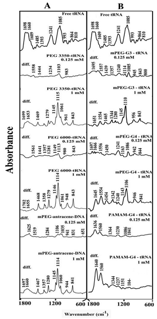 Figure 2 FTIR spectra and difference spectra [(tRNA solution + polymer solution) -(tRNA solution)] in the region of 1800-600 cm-1 for the free tRNA and its synthetic polymer complexes with PEG-3350, PEG-6000 and mPEG-anthracene (panel A) and for mPEG-PAMAM-G3, mPEG-PAMAM-G4 and PAMAM-G4 (panel B) in aqueous solution at pH 7.3 with various polymer concentrations (0. 125 and 1 mM) and constant tRNA content (12.5 mM).
