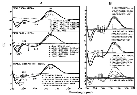 The reduced intensity of the band at 269 nm, in the spectra of polymer-tRNA complexes together with the major intensity changes of the band at 209 and 221 nm were attributed to the aggregation and particle formation of tRNA, in the presence of PEG-3350, PEG-6000, mPEG-anthracene (Figure 3, panel A) and mPEG-PAMAM-G3, mPEG-PAMAM-G4 and PAMAM-G4 (Figure 3, panel B). The extent of decrease of intensity was much pronounced in the case of PAMAM-G4 nanoparticle, where tRNA aggregation and particle formation were observed (Figure 3, panel B). This is consistent with AFM images of the synthetic polymer-tRNA complexes that showed major tRNA aggregation and particle formation by PAMAM-G4 nanoparticles (Figure 1, panel B).