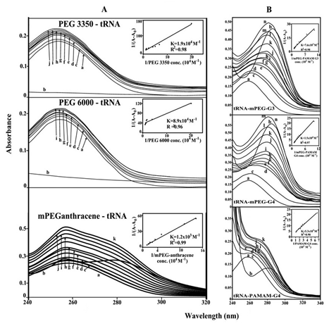 Figure 4 UV-visible results of tRNA and its PEG-3350, PEG-6000 (B) and mPEG-anthracene complexes (panel A) and for mPEG-PAMAM-G3, mPEG-PAMAM-G4 and μM PAMAM-G4 complexes (panel B) with free tRNA (100 μM); b) free polymer (100); titrated with polymer (5 to 80 μM). Plot of 1/ (A-A0) vs (1/polymer concentration) for K calculation of polymer and tRNA complexes, where A0 is the initial absorbance of tRNA (260 nm) and A is the recorded absorbance (260 nm) at different polymer concentrations (5 μM to 80 μM ) with constant tRNA concentration of 100 μM at pH 7.3.