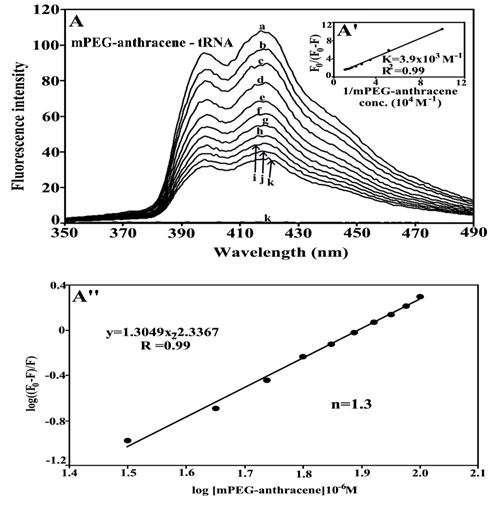 Figure 5 Fluorescence emission spectra of mPEG-anthracene-tRNA systems in 10 mM Tris-HCl buffer pH 7.3 at 25 ˚C for A) polymer-tRNA: (a) free mPEG-anthracene (80 μM), (b-k) with polymer-RNA complexes at 5 to 100 μM with (l) free tRNA 100 μM. The plot of F0/ (F0- F) as a function of 1/tRNA concentration. The binding constant K being the ratio of the intercept and the slope for (A’) mPEG-anthracene-tRNA. The plot of log (F0-F)/F as a function of log [tRNA] for calculation of number of binding sites occupied by mPEG-anthracene molecules on tRNA (n) in polymer-tRNA complexes (A’’).