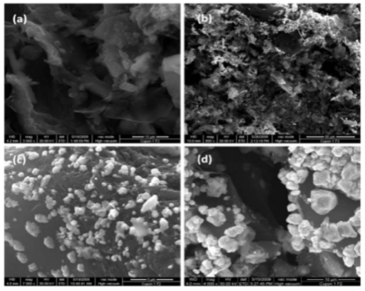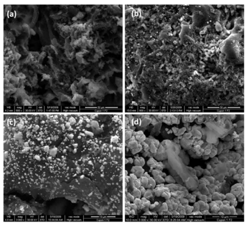 SEM micrographs presented in (Figures 1 & 2) corroborate that the AgNPs content supported on the carbon matrix is related with the concentration of the impregnation solution and the surface area of the GACs. This fact was also corroborated by elemental analysis as shown in Table 1. Since nature and concentration of the reductant must play a major role in controlling the silver nanoparticle size, it was assumed that the higher surface area determined in GACs activated with KOH (higher concentration of reductant groups) favors the primary formation of a large number of small clusters with a low coagulation barrier; their further irreversible aggregation was responsible for the presence of coarser agglomerates as observed in (Figures 1A-1D & 2A-2D).28-29