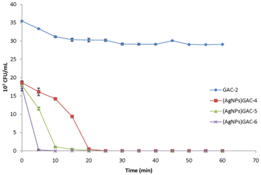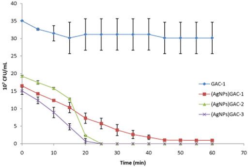 In Figure 4, E. coli concentration decrease when Ag nanoparticles in GAC are increased. For (AgNPs)GAC-3 (%Ag: 29.56 w/w), total E. coli was eliminated after 25 min of stirring. The same behavior was observed for (AgNPs) GAC-2 (%Ag: 23.62 w/w), while the GAC with the less quantity of Ag nanoparticles, (AgNPs) GAC-1 (%Ag: 7.49 w/w) was able to reduce E. coli after 45 min from t0: 16x107 UFC/mL to 96x105 UFC/mL After that, bacterial concentration remains constant until the end of the assay (60 min).