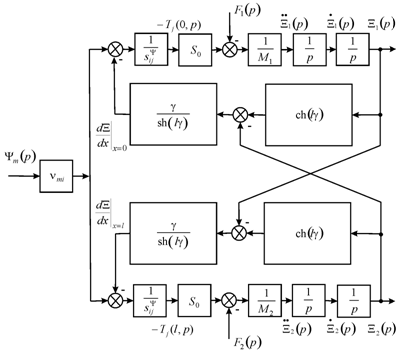 are the Laplace transforms of the appropriate displacements and the forces on the faces 1, From equations of the forces acting on the faces of the actuator, the equation of the electromagnetoelasticity, the wave equation we obtain the generalized structural diagram of the electromagnetoelastic actuator. The structural diagrams of the voltage-controlled or current-controlled piezoactuator are determined from the mathematical model of the electromagnetoelastic actuator. (Figure 1) The generalized transfer functions of the of the electroelastic actuator are the ratio of the Laplace transform of the displacement of the face actuator and the Laplace transform of the corresponding control parameter or the force at zero initial conditions.