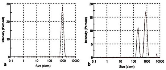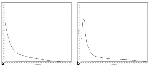 Figure 1 Particle size distribution of the nanoparticles produced by (a) Chemical synthesis (b) Biological synthesis.