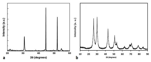 During chemical synthesis, diffraction peaks were obtained at 2θ values of 31,44,52 and 55 using XRD spectrum analysis (Figure 3A). On the other hand, during biological synthesis, diffraction peaks were obtained at 2θ values of 26,30,43 and 51 using XRD spectrum analysis (Figure 3B). To determine the size of the nanoparticles, the Debye-Scherrer equation25 is used which is given below: