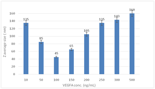 Conjugation of Anti-VEGFA and GNPs: The determination of optimum anti-VEGFA-Pab concentration was carried out according to the method described by Ye et al.22,23 with modification as follows: Serial dilutions of anti-VEGFA antibody solutions have been prepared (10, 50, 100, 150, 200, 250, 300, and 500ng/mL) in 20mM tris buffer. Then 10 µL from each anti-VEGFA concentration have been added to an eppendorf containing 100 μL colloidal gold adjusted to pH 7.3 using 2M sodium bicarbonate. The anti-VEGFA/GNPs conjugate were allowed to interact for an additional 2 hr at room temperature with gentle shaking. The residual surface of the GNPs was blocked and stabilized by adding 10 µL of 1% BSA in 20mM tris buffer with stirring for 30 min. The optimum anti-VEGFA concentration estimated using UV-Vis spectroscopy.24 and particle size analysis. After determination of antibody optimum concentration for conjugation and functionalization of GNPs, the anti-VEGFA/GNPs conjugate has been prepared at optimum condition as follows; 10 mL of GNPs adjusted to pH 7.3 was mixed with 1 mL of anti-VEGFA (100 ng/mL) and allowed to react for 2 hr.