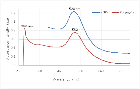 The functionalization of GNPs with anti-VEGFA antibody lead to mild red shift in the absorbance peak of GNPS from 520 nm to 532 nm as a function particles size growth due to antibody conjugation, (Figure 2A). Appearance of the characteristic antibody peak exhibited at 280 nm corresponding to tryptophan group, assure the formation of the anti-VEGFA/GNPs conjugate.35