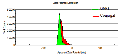 Zeta potential measurements of GNPs and anti-VEGFA/GNPs conjugate, (Figure 2C) the antibody/gold nanoparticles conjugation process. Where the zeta potential of GNPs was -38.9 mV due to encompassing surface of GNPs with citrate carboxylic groups. Zeta potential of anti-VEGFA/GNPs conjugate was -25 mV indicates the replacement of the negative charges of citrate ions with the positive charged VEGFA antibody. The type of interaction between anti-VEGFA and GNPs was not studied under this study but it may be electrostatic interaction rather than covalent interaction.