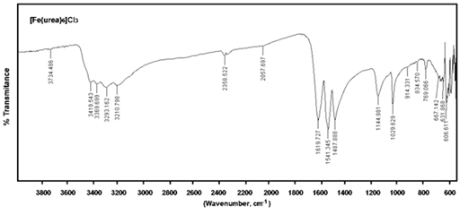 Almost mono dispersed magnetic hollow nanocapsules (MHNCs) were obtained by a solvothermal reaction from the thermal decomposition of the [Fe(urea)6]Cl3 complex used as metal precursor. The infrared absorption spectra (FTIR) of the iron (III) urea product confirmed that the [Fe(urea)6]Cl3 complex was successfully obtained (Figure 2). A strong absorption band corresponding to a C=O stretching vibration appears at 1619 cm-1, while a band corresponding to a C-N stretching vibration is observed at 1487 cm-1. These bands are shifted from the typical values for free urea (1686, 1466 cm-1) as expected for an urea coordinated to a Fe3+ ion. Another medium band appears at 3210 cm-1, characteristic of a N-H stretching vibration, as well as a C-O stretching vibration at 1029 cm-1.