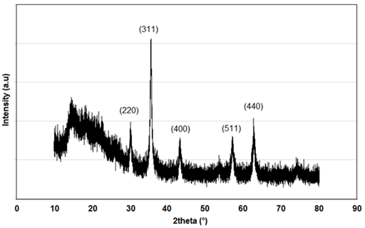 Once the iron metal complex hydrolyses the thermal decomposition of urea yields carbon dioxide microbubbles which are used as templates for the hollow nanocapsules formation. Ethylene glycol, a high boiling point solvent (196-198°C) played a key role in the preparation method as a dispersing medium as well as reducing agent and a stabilizing surfactant. The chemical reduction of Fe(III) under the experimental conditions to Fe(II) by EG and the condensation of these cations into a spinel-type structure (as confirmed by the XRD analysis), explain the formation of a highly crystalline phase of magnetite/maghemite after 24 hours of reaction, as shown in the diffractograms of (Figure 3). Comparison of the obtained XRD pattern to that of magnetite (JCPDS No. 79-1417) confirm that all diffraction peaks (220, 311, 400, 511, 440) corresponds to a face cubic centered (fcc) crystalline phase pattern, characteristic for Fe3O4, indicating that the MHNCs were successfully obtained. Due to the small amount (and poor crystallinity) of the loaded SMF, no attempts were made to analyze by XRD the SMF loaded MHNCs as the only expected diffraction peaks would be those corresponding to the MHNCs.