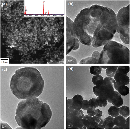SEM analysis of the MHNCs clearly show that the products have a spherical morphology (Figure 4a). The particles are agglomerated and are uniform in size and shape. EDS chemical composition analyses of these particles (Fe, 72.8%; O, 27.2%) are in agreement with what is expected theoretically for magnetite (Fe, 72.4%; O, 27.6%). Average size of the hollow spherical particles is in the range from 220 to 230 nm. TEM images (Figure 4b-4d) indicate that the particles possess a porous shell, with a shell thickness of about 50-60 nm. Some of the analyzed MHNCs have an open structure, showing the empty inner cavity, clearly indicating than their surface is rough and non-uniform.
