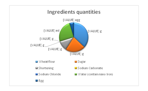 Nano Iron fortified biscuits with three Iron concentration levels (10 ppm, 30 ppm, 60 ppm) were prepared according to cookie method 10-52-02 (AACC 2010)16 without ascorbic acid with slight modifications. In brief, the selected concentrations of Iron nanoparticles were dissolved in the amount of water used during blending process to ensure proper mixing of the iron nano particles with the flour. To achieve homogeneous flour and to ensure the level of fortification claimed, samples of the fortified flour were collected during blending and assayed for iron concentration. This process was carried out until the concentration of iron was similar in the sample taken from various section of the dough. Other dry ingredients (sugar, shortening, sodium carbonate and sodium chloride) and eggs were blended with the flour and dough thoroughly kneaded. Figure 1 illustrates the basic Nano iron fortified biscuit composition. The dough was then placed on a cutting board, rolled out until uniform thickness and textures were obtained. Biscuit cutter was used to cut the sheet of rolled dough into desired shapes and sizes, then baked in oven at 220 °C for about 15 min. the cooked biscuit was allowed to cool at room atmosphere, packed and store according to Kure el al.17 The finally, the final iron concentrations for all cooked biscuits groups were measured by Inductivity Coupled Plasma (ICP) instrument (PerkinElmer ICP-OES: Optima 2000, Germany).