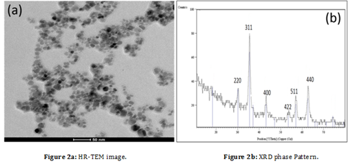 Iron nanoparticles (Magnetite, Fe3O4) were prepared according to a previously described method. TEM image showed spherical shaped particles with average size of 20 ± 5.0 nm as illustrated in Figure 2a. For phase analysis, XRD patterns for the as-prepared iron nanoparticles is shown in Figure 2b. Characteristic pattern peaks are observed at 2θ values of 30.11o (220), 35.47o (311), 43.05o (400), 56.94o (511) and 62.51o (440) in the pattern consistent with the cubic phase spinel structure Fe3O4 (JCPDS: No. 04-006-6497). The estimated crystal size using Scherrer’s equation was 25 nm, the obtained results were consistent with the previously published literatures.23,24