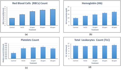 Iron deficiency anemia was by feeding the experimental rats iron free basal diet until the mean blood hemoglobin concentration (Hb) and Red Blood Cells count (RBCs) were 9.8 ± 1.2 g/dl and 3.4 ± 0.9 x 106/mm3 respectively. Treatment groups were divided into three levels of nano iron fortified biscuits, (10 ppm, 30 ppm and 60 ppm) and one level of Ferric chloride fortified biscuits (FeCl3), (30 ppm) in addition to untreated control group (nourished iron free diet). Daily nourishment were carried out for five weeks then Hematological tests were performed, (Figure 5a & 5b) Hemoglobin concentration and erythrocytes count as indicator for iron deficient anemia recovery. For the tree levels of nano iron fortified diet; 10 ppm, 30 ppm and 60 ppm, Hemoglobin concentration increased to be 14.6 ± 1.1 g/dl, 16.7 ± 1.6 g/dl and 18.2 ± 2.1 g/dl respectively. While for RBCs count increased to be 6.7 ± 1.4 x 106/mm3, 7.3 ±1.6 x 106/mm3 and 7.8 ± 1.8 x 106/mm3, respectively. The increase in both Hb concentration and RBCs count might be attributed to the stimulation of erythropoiesis process by nano iron formula as a result of efficacy of the Nano size for intestinal absorption and cellular uptake on addition to increase the nutritional quality of proteins in gut. While the group treated with FeCl3 fortified biscuits, Hb concentration and RBCs count increased to be 12.7 ± 1.4 g/dl and 5.2 ± 1.8 x 106/mm3, respectively, indicating hypochromic anemia. All the obtained results were compared to the control untreated group. These results confirm the success of the prepared nano iron fortified biscuits to be used at least for management and control Iron Deficiency anemia. Leukocytes and platelets blood indices were tested for any abnormal deviations. (Figure 5c & 5d) indicate no abnormal changes were observed in all treated groups compared to the control one. Normal leukocyte counts reflected the non-immunogenic nature of the used iron forms while the normal platelets counts indicated normal factionalized platelets biosynthesis process.