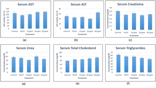 Blood samples were collected at the end of designated period (five weeks) after treatment (three time points of analysis in total). Using biochemical analyzer (Merck MiroLab 200). General serum biochemical investigations were carried out; for liver functions, serum levels of Aspartate Transaminase (AST) and Alanine Transaminase (ALT) enzymes while, serum Urea and Creatinine for kidney function in addition to serum Total Cholesterol and Triglycerides.