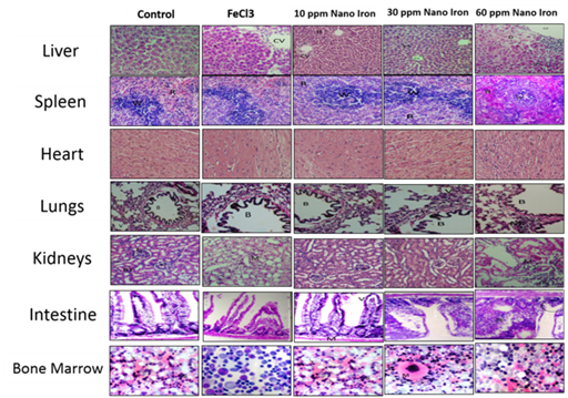For all groups except the 60 ppm nano Iron group showed mild inflammatory cells infiltration in between the degenerated renal tubules. Histopathological examination of the intestine showed normal histological structure of the villi and muscularis for all groups. Moreover, branching of the villi was observed for 30 ppm and 60 ppm Nano Iron groups revealing the efficiency of Nano iron to improve the bioavailability abd absorptivity inside the intestine. This observation explained why the iron in nano form is more effective for treatment iron deficiency anemia in a very short time compared to the conventional iron forms. Bone Marrow smears of all animal groups showed no histopathological alternation observed where normal megakaryocyte and erythroid islands and normal leucocytes was observed compared to the control group. From the toxicological point of view, the inflammatory cells infiltration observed in high dosed 60 ppm Nano iron group with liver, kidney and lung in addition to lymphoid depletion in white pulp of might be attributed to the normal nonspecific immunological response against high dose concentration irrespective to its nano structural form.
