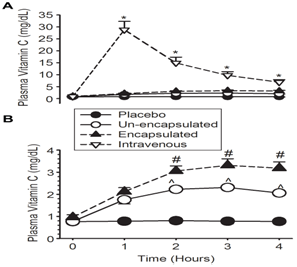 Figure 2 Plasma concentrations of vitamin C (ascorbic acid) before (time = 0 minutes) and after supplementation. (A) All treatments. (B) All treatments excluding intravenous administration. *P < 0.001 vs. all other treatments; # P < 0.001 vs. unencapsulated oral and placebo; and ^P < 0.001 vs. placebo. (Reproduced in full with permission from 21).