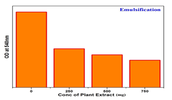 The extracted control and treated EPS solution (2 mg mL-1 in deionized water) was heated at 100ºC for 15 min followed by cooling (25ºC) and the volume was made up to 2 ml using phosphate buffered saline (PBS). One ml of olive oil was added, vortex for 1 min and the absorbance were measured after 30 min. at 540 nm. The emulsifying activity was calculated in terms of percentage and the graph was plotted.11