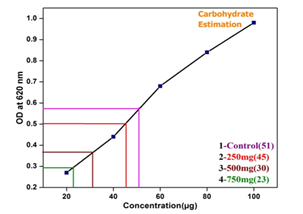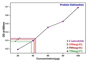 The optical density of the control and treated EPS revels that the amount and inhibition percentage of the protein in the given sample by measuring at 660 nm (Figure 6) and inhibition percentage of carbohydrate in the given sample was measured at 620 nm (Figure 7). The gradual decrease in the amount of protein and carbohydrate in control and treated EPS were calculated in terms of percentage. The amount of protein in EPS decreases with the increase of plant extract. This variation in control and treated EPS is due to increase in plant extract concentration (Table 1 & 2).