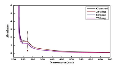 The biophysical characterization was studied using UV visible spectroscopy. UV- Vis spectroscopy analysis of control and treated EPS revealed major absorption peak at 270nm. A major absorption peak near 270-280nm in both control and treated samples (Figure 8).