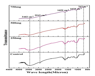 Fourier Transform Infrared spectroscopy was used to find out the biomolecules. FTIR spectrum shows peak at 707cm-1, 1075 cm-1, 1659 cm-1, 2942 cm-1, 3462 cm-1 which confirms the presence of carboxylic group, O-acetyl ester linkage bond, C-H stretching of sugar molecules, C-H functional groups and hydroxyl group respectively (Figure 9). The gradual decrease or disappearance of peaks reveals the reduction of protein and carbohydrate content in the EPS of Staphylococcus aureus when treated with Sesbania grandiflora.