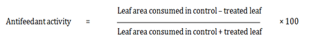Antifeedent activity: The plant extracts possessing antifeedant and insecticidals activities against several insect-pests has been demonstrated. The SNP synthesized using leaf aqueous extract of Manilkara zapota shows feeding deterrent activity against Musca domestica .36 The leaf disc no choice method is usually employed.37 In this, a fresh leaf disc of around 4 cm in diameter is dipped in varied concentrations of synthesized SNP extracts. The water can be taken as negative control and the leaf extracts as positive control. The petri dish is covered with hydrated filter paper, and one third instar larva may introduce into each petri dish. The consumption of leaf area by the treated and control larvae after 24 h was recorded using leaf area meter. The Leaf area, eaten by larvae in treatment was corrected from the negative control. The antifeedant activity could be measured using the formula given in Figure 4. The potential antifeedant (92.40 %) activities against H. armigera with LC50 values of 365.72 was recorded by.38
