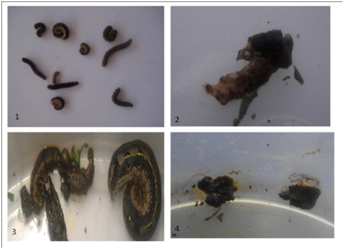 Figure 6 The effected larvae of S. litura after the treatment of (1) control, CdS (2), Nano-Ag (3) and (4) Nano-TiO2 is shown and the picture have been taken from.42