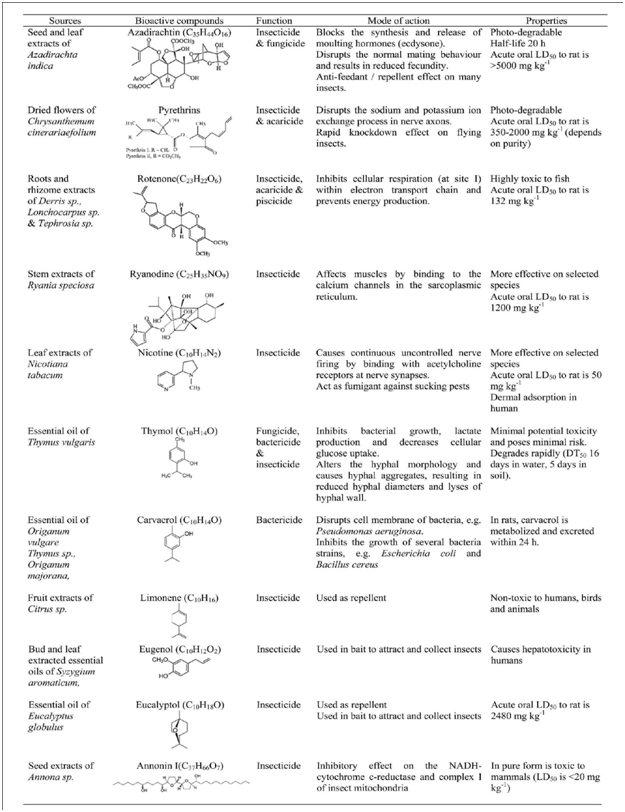 Table 3 Some sources of botanical pesticides, active compound and their mode of action. The data have been retrieved from23