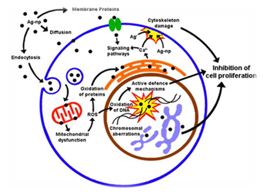 Uptake of free silver nanoparticles followed by disruption of ATP production and DNA replication,